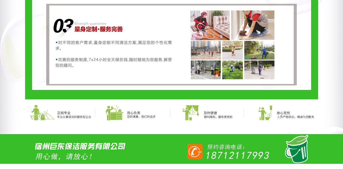 宿州市巨東保潔服務(wù)有限公司是一家專(zhuān)門(mén)為公寓、公司、賓館、單位、商場(chǎng)、工礦企業(yè)、學(xué)校等大型公共場(chǎng)所提供長(zhǎng)期、全面的保潔、保養(yǎng)、維護(hù)、消滅殺等服務(wù)的專(zhuān)業(yè)團(tuán)隊(duì),并且我們與各大保潔公司都有合作關(guān)系,更好的為客戶(hù)服務(wù)。